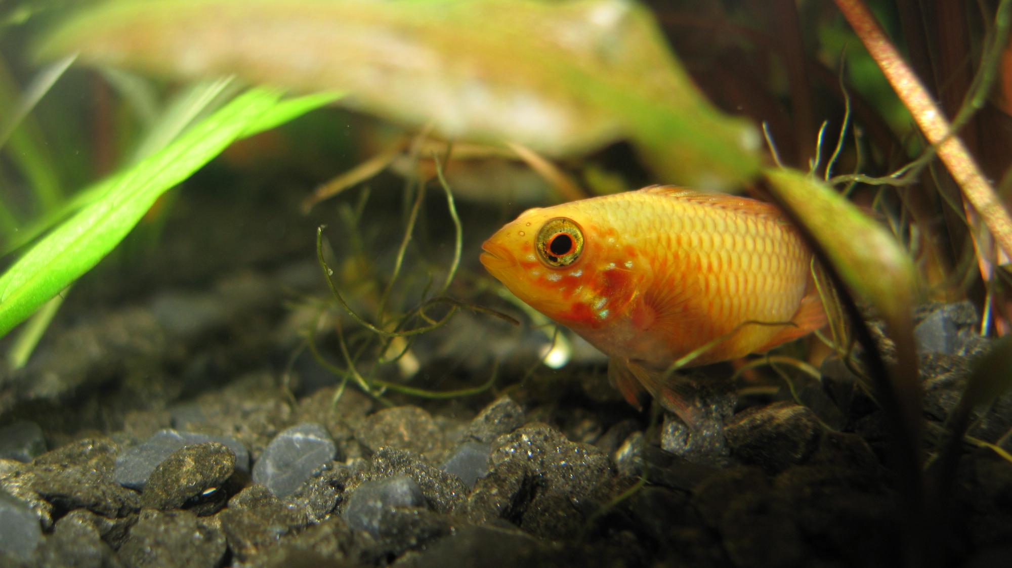 Пока одинокий самец Apistogramma hongsloi (вроде бы от iya, вроде бы Gold Red). В будущем хочу ему подругу и пару других апистограмм, но пока не определился каких. Душа лежит к какаду или агассици, но выбирать буду наименее требовательных.