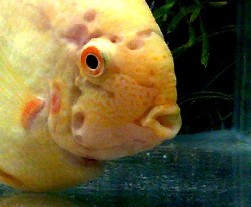 • - самым существенным симптомом является эрозия и изъязвление покровов головы, а также значительное изменение внешнего вида боковой линии. В обычном состоянии она малозаметна, а вот при заражении становится хорошо видимой, при этом приобретает беловатый оттенок, визуально расширяется. В редких случаях возникают глубокие отверстия в кожном покрове, из них выделяется белая масса. В основном такие дыры проявляются в начале на боковой линии, а потом на голове. Размеры дыр варьируются и зависят от размеров самой рыбы. Могут быть маленькие отверстия диаметром около миллиметра или большие до сантиметра.