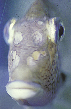 • - первоначально происходит ухудшение аппетита, а затем и полный отказ от пищи. Иногда возникают ситуации, в которых рыбы берут корм ртом и затем выплевывают его, причем это повторяется многократно. Такое поведение указывает на легкую форму заражения.
