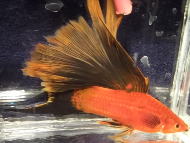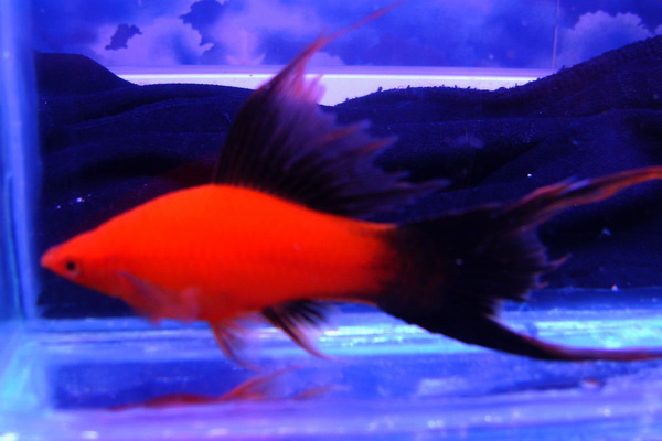 Сфотографировал одного из флаговых самцов. Спинной плавник у флаговых и юбка у самок растут всю жизнь . Очень больших размеров достигают после года. Я задумываюсь о обрезании плавников мечам - производителям/особенно самкам хвосты/ , как это делают гупешкам. Самки после 1,5 лет уже не в состоянии таскать свои юбки. на фото полугодовалая самка и годовалый самец. Верхний плавник у самца до полугода был черный , потом обтрепался и обесцветился до красноты.