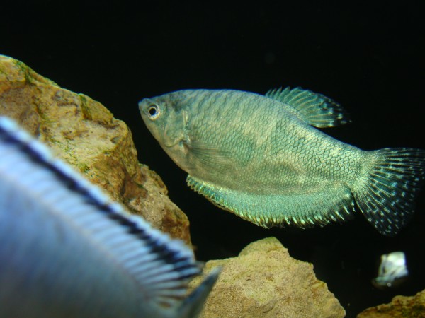 Прошло уже почти 2 года. Полностью обновился состав рыб. Изменился вид в аквариуме - камни полностью обросли, добавилась лампа синего спектра. И вот что получилось: