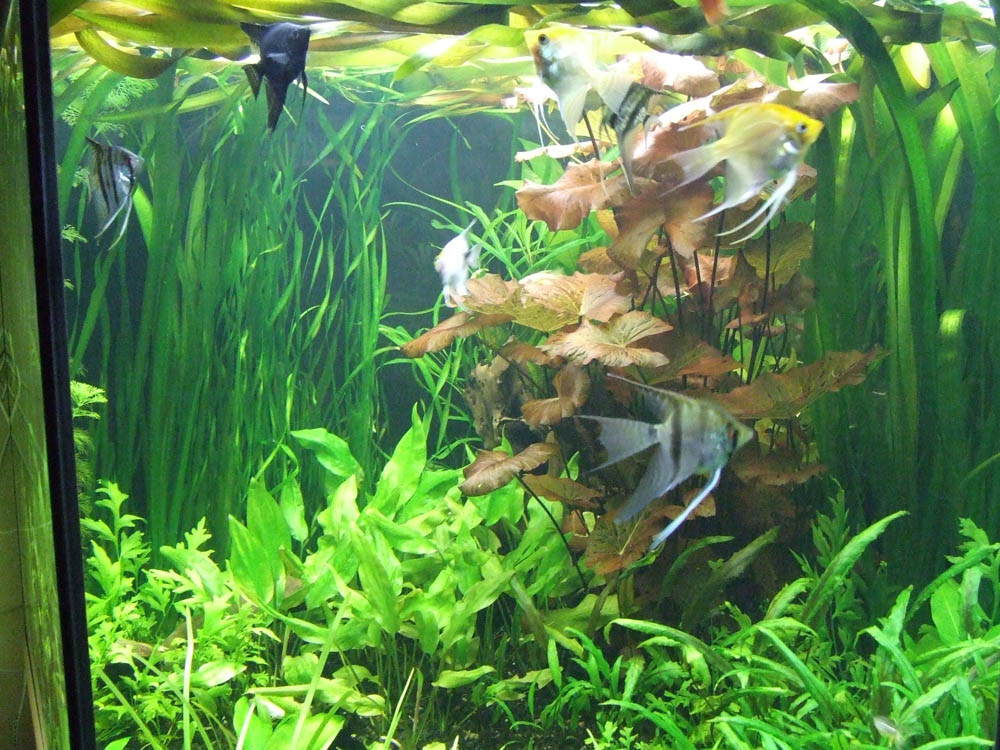 Так как перезагрузка у меня заняла почти две недели (еще и горячую воду отключили), то много растений погибло  а некоторые которые вы видите приходят в себя сейчас. Нимфея побрасывала листья, но выпустила много новых, некоторые эхи покрутили листья, но выпускают сейчас новые прямые листочки. Вобщем наращиваем сново массу растений. Рыбы так много (особенно скалярий) так как это рыба уже моего разведения, собираюсь тут на форуме раздавать/продавать.