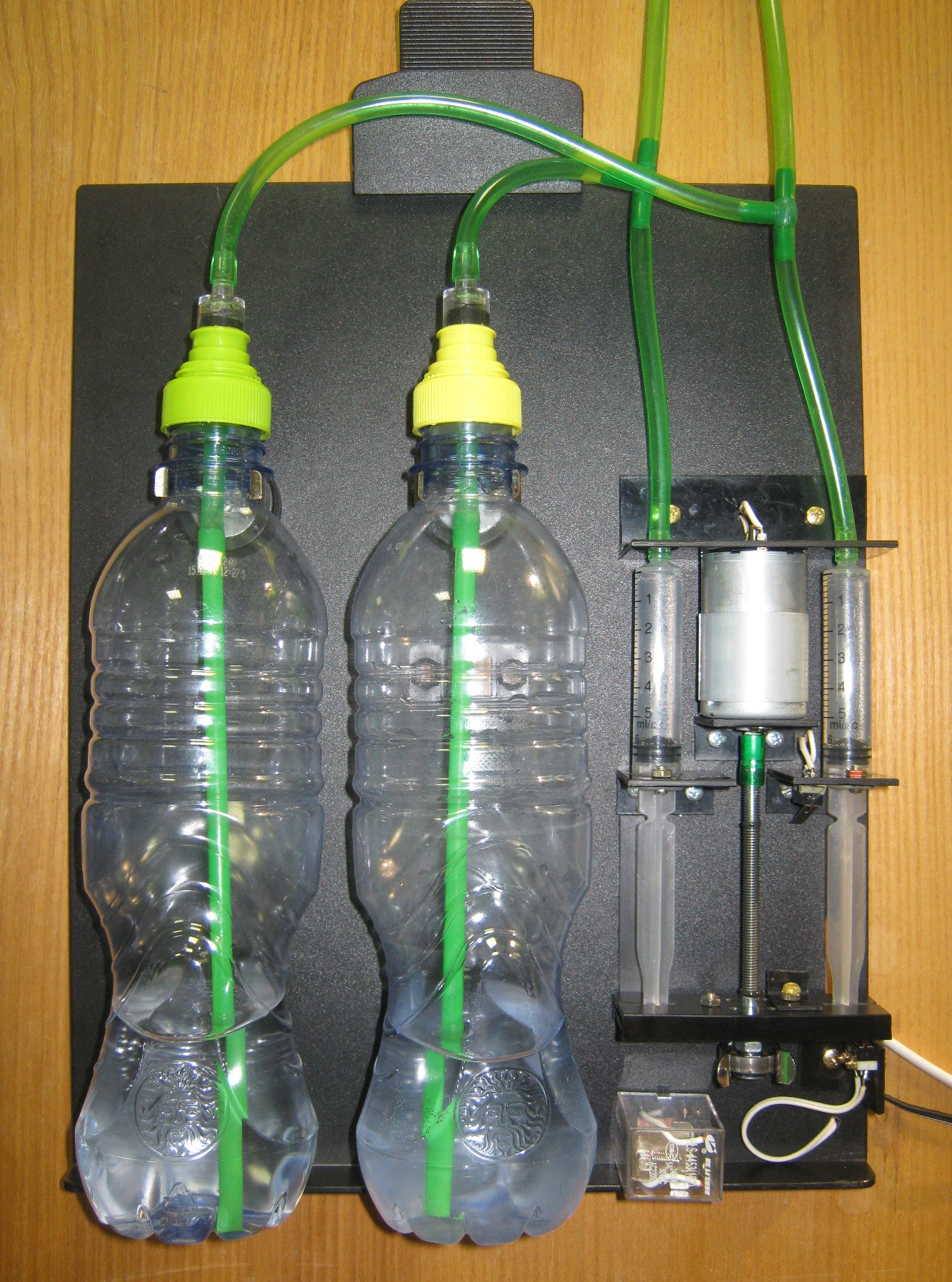 В качестве насоса использовал одноразовые шприцы с резиновым поршнем на 10 мл, но можно поставить и на 5 мл и на 1 мл. Привод штоков шприцев - винтовой. Винтовые механизмы используют в различных станках для точного позиционирования (точнее шариково-винтовые механизмы). В бюджетном варианте вполне подойдет обычный стальной болт с гайкой. Гайка вставлена в пластиковую (ПВХ)трубку, которая и двигает штоки двух шприцев. Винтовой механизм проще изготовить "на коленке" по сравнению с обычно используемым кривошипно-шатунным.