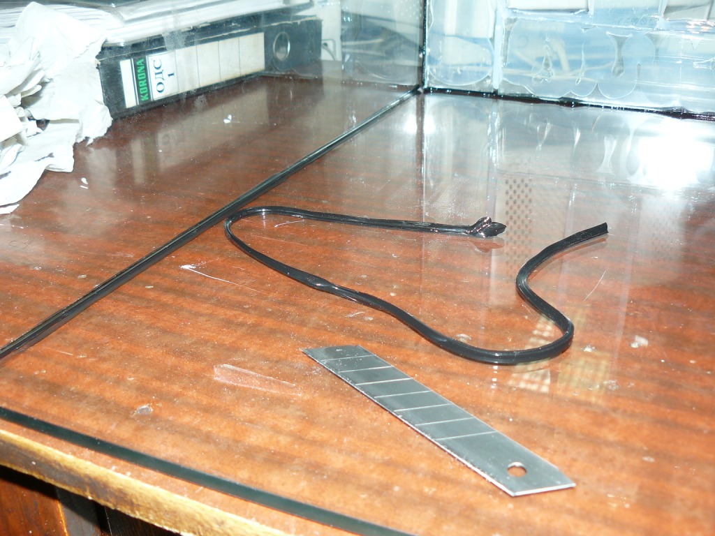 Согласитесь не очень аккуратно, хотя если набить руку и наносить герметик нужной толщины и ровным швом, то можно и не обрабатывать .Но пока умею только так. Сутки прошли, иду в ночь на работу за одно обработаю швы и кое что еще сделаю. Вооружившись лезвием от канцелярского ножа, приступаю к обрезке излишек герметика. Как бы объяснить? Стекла приклеены таким образом: лицевые наложены на боковые, это видно на фото выше, лезвие плотно прижимая к боковому стеклу, от дна до самого верха подрезаю герметик. Таким же образом подрезаю вдоль лицевого стекла, но тут момент один, главное не резануть между стеклами. Не с первого раза, но я понял, как нужно держать лезвие, чтоб не совершить ошибок))). Если кто и применит этот метод, то сообразит, как это делается. Смотрим фото: