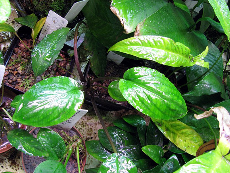 Piptospatha ridley - ароидное, близкий родственник лагенандр и криптокорин, условия содержания те же, я держу в теплице, выростает до 20 - 25 см, длина черешка равна длинне листа, жилки снизу листа красно бурые, черешек тонкий, в общем растение очень элегантно смотрится.