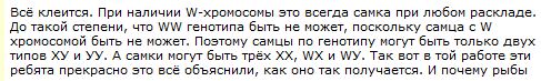 Я смотрю Вы бедного Сторожева на Клубе Гуппи тоже заколебали . Есть ли у мечей гонасомы или нет. Если надо я забугорную сноску приведу. А насчет получения в помете только самцов попробую чтоб дошло на пецилиях пояснить . У Мексиканских пятнистых пецилий самки ХХ , а самцы ХУ. У пестрой пецилии из Гондураса - другие гонасомы . У самок - W и Z , у самцов , соответственно , только две ZZ- гонасомы. В следствие скрещивания пецилий различного географического происхождения может случится так , ZZ - самец оплодотворит ХХ самку. В результате получится потомство , которое на 100% будет состоять из ХZ - самцов. Самок не будет вообще. Если поняли поясните?