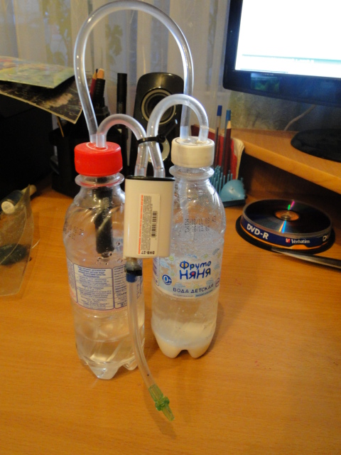 Запуск, он производится очень просто, перекрываем кран подачи СО2 в аквариум и сдавливаем рукой бутылку с кислотой, выдавив немного ее в соду, реакция начинается мгновенно и давление в обеих бутылках резко увеличивается (1-2,5 атмосферы).