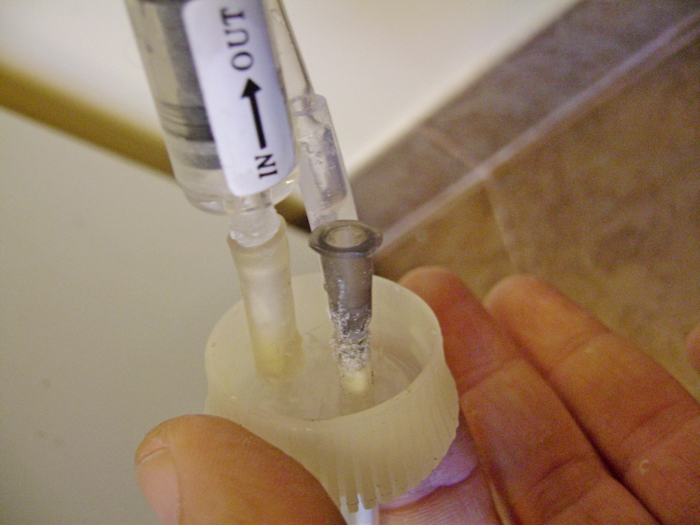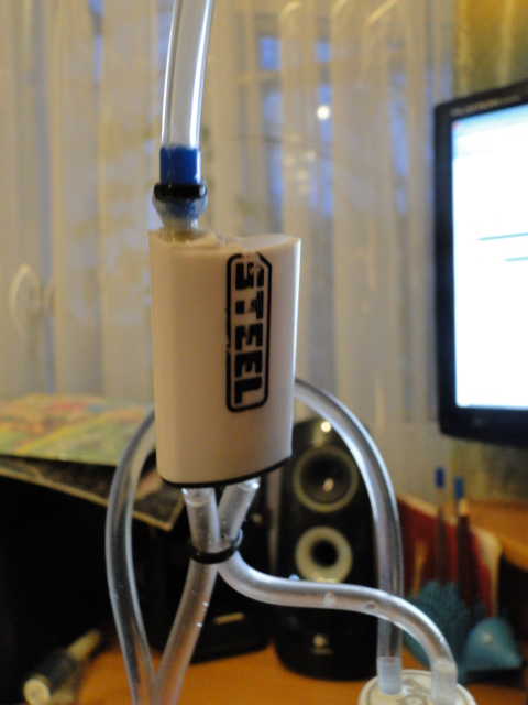 Р.S.-По рекомендациям Господина BelkinS-а можно сделать так: в крышечке от бутылки высверлить два отверстия диаметром 6мм (нужно сверлить острым сверлом и аккуратно, чтобы отверстие было с ровными краями), в них вставить шланги тоже диаметром 6мм (толстостенные компрессорные), так чтобы с внутренней стороны крышки они выходили примерно на 5 мм. И изнутри в шланги вставил белые штуцеры от капельницы. Они входят в шланги с усилием и за счет расширения шланга в этом месте, намертво загерметизировали соединение. Дополнительно ничего не проклеивал.