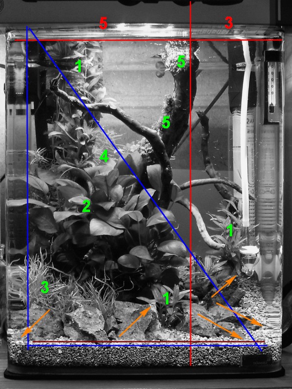 Ваша работа "Долина сказок" мне нравится больше остальных, может быть потому, что я более поклонник оформления аквариума в стиле ивагуми  однако как на мой взгляд, если в "Долине сказок" растения заднего плана не будут превышать "зеленых" линий(как указано вами на рис.-схеме), то будет приятное ощущение созерцания именно вершин гор, если же растения заднего плана все-таки будут переваливать условленную "зеленую" линию, то будет ощущения наблюдения гор издалека на фоне иных высот или обросших зеленью холмов, если конечно это правильно показать. и это не портит картину-лично мое мнение