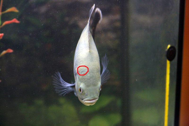 Плавает туда сюда без передышки, понизился аппетит, на голове есть 2 потемневших участка, то ли от удара об острые края, то ли от болезни непонятно. Увидел только сегодня, вчера вроде не замечал. Это болезнь? Может авитаминоз я его все время одной только печенью кормлю?