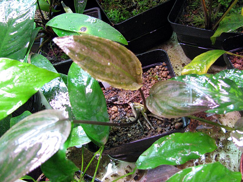 Piptospatha ridley - ароидное, близкий родственник лагенандр и криптокорин, условия содержания те же, я держу в теплице, выростает до 20 - 25 см, длина черешка равна длинне листа, жилки снизу листа красно бурые, черешек тонкий, в общем растение очень элегантно смотрится.