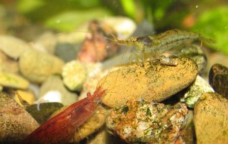 Красненькие креветки живут отдельно, начинают размножаться. На днях видела микроскопического младенца, можно все глаза поломать, пока такую малышню высмотришь.