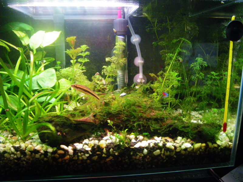начинаю считать. я уложил метр белой ленты. это 60 светодиодов по 17 люменов каждый. итого около 1000 люменов. еще штук 40 красных и синих без счета (они маленькие и часто идут) в общей сложности получилось около 25 Ватт светодиодной мощности на 20 литров воды с учетом малой глубины. по всем признакам это много.