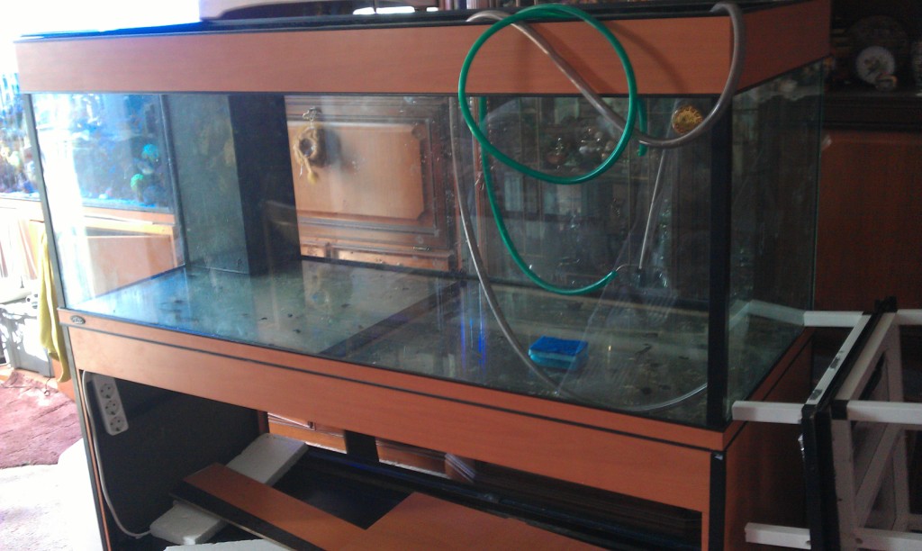 Итак,3 дня двигания аквариума по всей комнате(слава Богу) закончились...Должен Вам заметить,что баночка то не легкая,под 150 кг где-то,вдвоем еще то удовольствие таскать...Но повезло,что место ему нашлось на другом месте(не там где 330 литров стоит)А это означает,что у меня нет спешки к переезду,и могу все плавно и по не многу переносить,особенно меня это радует из-за рыбы-что бы не стрессовала...