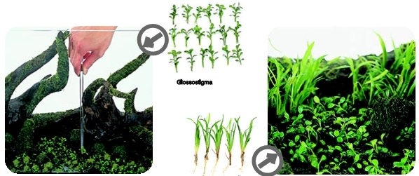 1. Во-первых начинайте садить Глоссостигму(используйте специальный пинцет) около коряги или камня и двигайтесь к переднему стеклу. Будет проще, если вы нальёте немного воды.