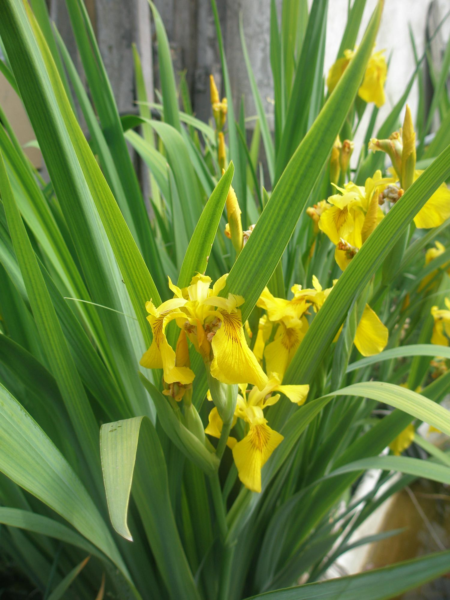 Цветут аировидный ирисы сорт и ирис аировидный "Бастарда" (светло-жёлтый) .