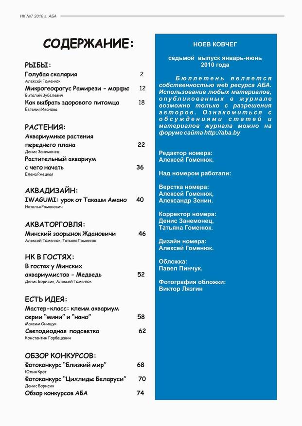 Представляем Вашему вниманию очередной номер аквариумного журнала «Ноев Ковчег». Это уже седьмой выпуск. В нем мы поменяли традиционную манеру изложения материала и немного изменили дизайн. Белорусские аквариумисты работали над ним с любовью. Возможно, кто-то скажет «слабовато». Не судите строго. Мы делаем любительский журнал, целью которого является популяризация аквариумистики и не только в нашей стране. Мы не ставили цели создать коммерческий проект. Этот журнал доступен всем. Мы выкладываем его в свободный доступ.