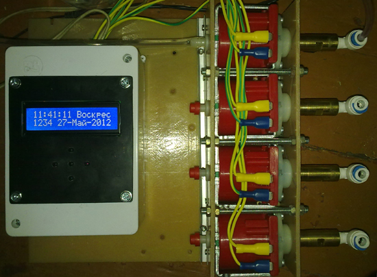 Конструктивно устройство состоит из блока управления и четырех помп. У меня это все закреплено на куске листового полистирола.