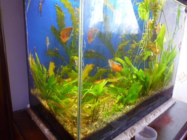 акваріум приблизно 180 л. д148*ш18*в65 світло 2*36 т8 765 фільтр 1200л/г атман + мочалка потік води направлений вертикально і створює на поверхності води достятню сильну течію, додаткова подача повітря за допомогою компресора відсутня, гунт 7 см фракція від 2мм-8мм (заливав оцтом (уксусом) вродіби не шипів), населення 10 малих скалярій декілька анцитрусів і крапчпстих сомів і 9 северумів малих