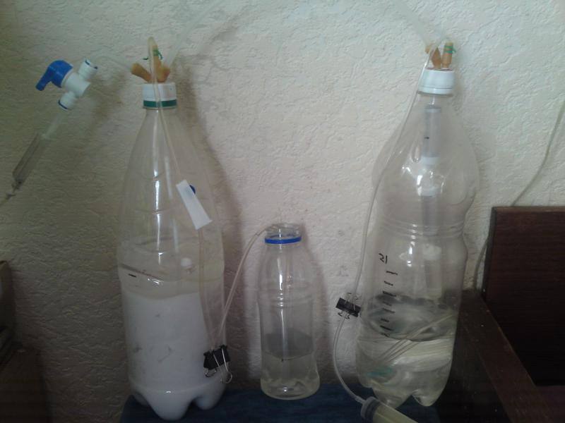 У Юрия Владимировича по этой схеме вполне успешно прошел испытания и работает и генератор на 0,5 кг соды и 0,4 кг ЛК. (Фото 5) Выполнен он из 3-х литровой баклажки (содовая сторона) и 2-х литровой бутылки (кислотная сторона). Принципиально ничем не отличаясь от известной уже всем схемы Бесклапанного генератора Юрия-TPV с доработками по отверстиям в стакане, изложенными выше, он имеет, все же одно отличие, связанное с масштабным фактором, а именно, высотой тары. Для уменьшения гистерезиса, внутренний диаметр трубок подачи кислоты в соду уменьшен до Ф 1 мм. Как только это было сделано - он заработал "как часы".