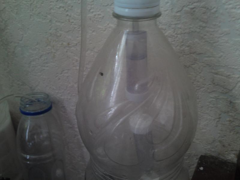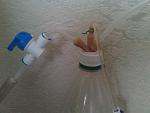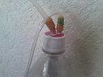 Р.S.-По рекомендациям Господина BelkinS-а можно сделать так: в крышечке от бутылки высверлить два отверстия диаметром 6мм (нужно сверлить острым сверлом и аккуратно, чтобы отверстие было с ровными краями), в них вставить шланги тоже диаметром 6мм (толстостенные компрессорные), так чтобы с внутренней стороны крышки они выходили примерно на 5 мм. И изнутри в шланги вставил белые штуцеры от капельницы. Они входят в шланги с усилием и за счет расширения шланга в этом месте, намертво загерметизировали соединение. Дополнительно ничего не проклеивал.