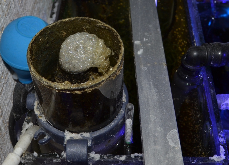 Одно отделение, стоит помпа для забора воды, она уже вся заросла водорослями, так что поток который выходит из нею проходит через жмут водорослей, мимо пенника и попадает в акву самотеком.