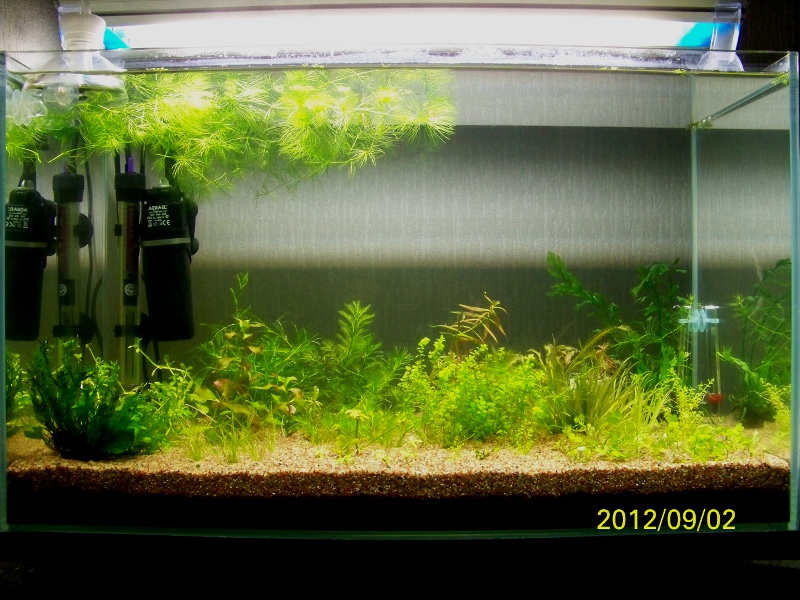 Появились робкие намеки на водоросли типа мелкой нитчатки, возможно надо чуть-чуть увеличить дозу удо. Тесты вечером 2012/09/13 показали теже цифры что и раньше: PO4 ~0,05мг/л; NO3 ~2-3мг/л. В теме "911 помощь по растениям" я наткнулся на мнение GOREZ о том, что таки фосфаты могут (и должны) обнуляться к концу дня в хорошем травнике. По крайней мере могу сказать, что сразу после запуска у меня на переднем стекле было несколько зеленых точек ксенококуса, а сейчас их нет.