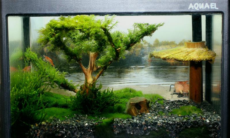 Не думаю, что нужно подробно описывать весь аквариум еще раз. Хочу отметить только, что биотоп я старался максимально приблизить к реальному деснянскому. Песочек- с берега Десны, коряжка, изображающая дерево- оттуда же. С Десны же и теодоксусы (попрятались чего-то, на фото не видны), кладофора- почти оттуда же- с Днепровского залива. Ну, мхи и креветки, естественно не дикие))) На сегодняшний момент аквариум постепенно дефорсируется и готовится жить своей спокойной жизнью в комплектации завода- изготовителя.