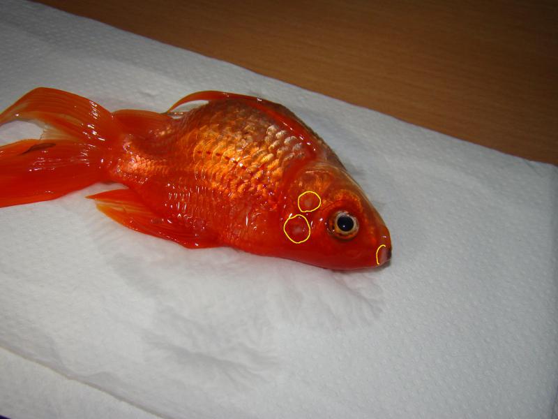 Сегодня утром рыбка все-таки умерла  ( Может от болезни, а может из-за того, что ночь была в банке? Очень жалко была красотка, мы ее так и прозвали. Внимательно ее осмотрели у нее были в трех местах белые пятна, ас другой стороны темное пятно, есть фото, вопрос теперь в следующем: что это за болезнь и не заражены ли теперь другие рыбки? Кстати, когда покупали, она была в отдельном аквариуме с карасем такого же размера, даже ее не рассматривали при покупке на наличие каких-то заболеваний-доверились продавцам