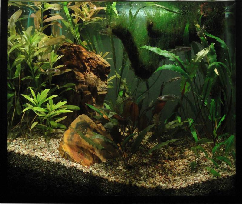 Аквариум 100 л., запускался в 2006 г. и не перезапускался. Создавался с целью посидеть посмотреть на рыбок - расслабиться, посему растения растут без удобрений, СО 2 и т.п. - как растут так растут, вода подменивается крайне редко, в основном - долив при сифонке может раз в месяц, при этом возраст пары скалярий перемахнул за 6 лет и чувствуют они себя неплохо. кроме скалярий населен неонами, расборами, кардиналами, родостомусами, парой SAE и анциструсами и весьма злобной  самкой попугая возрастом тоже за 6 лет...