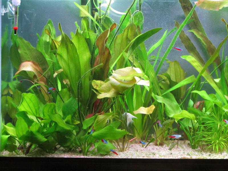 На фото аквас 01.10.12 после уборки. 30.09.12г. было выброшено около большого ведра сильно обросших водорослями листьев эхинодорусов, нимфей, кринума.