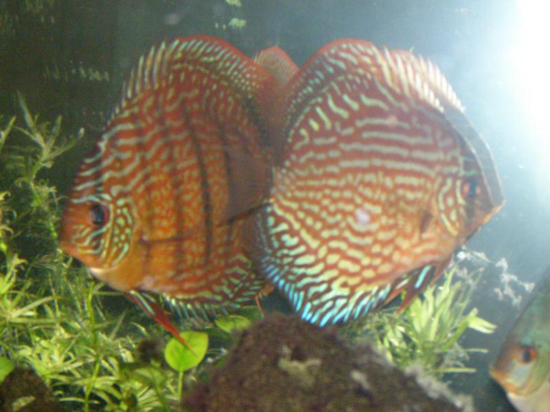 Первый опыт с дисками Красный Туркис. Рыбасям "крупным" 1 год и 3 мес, подымались с малька 4-5см в 200л аквариуме травнике там где и сейчас находятся (Т 28-30 С, вода "жесткая" из под крана).