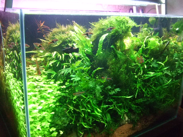 Исключительно импровизация.Мне всегда нравились "Голландцы".В акве две коряги Мопани ,что ли.Оснавная масса папороти крепится к камешкам .Я могу их извлекать для" ТО",могу менять дизайн.Вообще выбор растений продиктован наличием свободного времени.Хотел дольше сохранить композицию,меньше перекапывать.