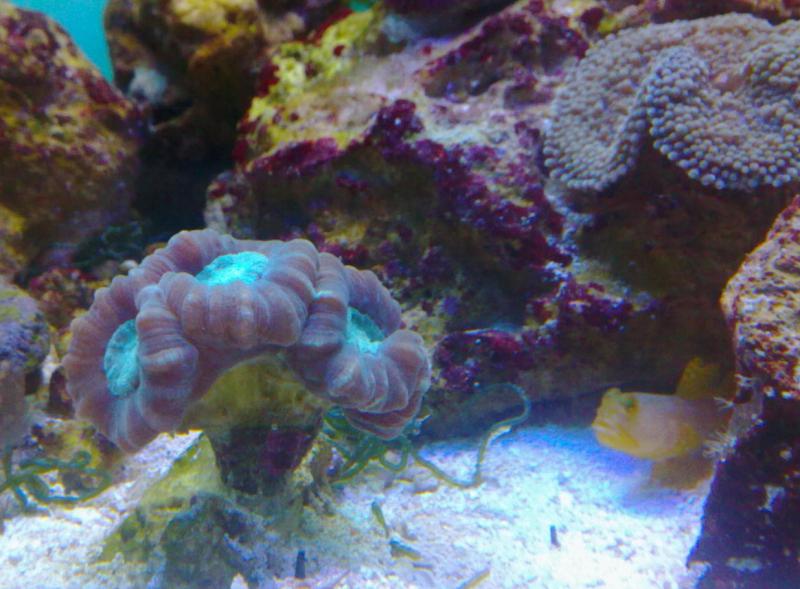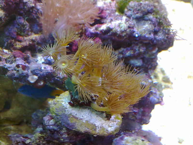 Отмечусь в темке. Аквариуму 3,5 месяца. Три рыбки потихонечку заселяю коральчиками. Поменяла соль на HW reefer для подмен. Были проблемки поплохело эуфиллии, не открывались долго новоприобретенные зонтики от чего измельчали и потеряли цвет, сейчас вроде очухиваюся цвет набирают . Эуфиллию отдала на время чтоб не отошла в мир иной. Проблема скорее всего была из-за пресола 1,028 (как оказалось не правильно показывал поплавок) так как тесты были в норме (перепроверяла у форумчан). Расплодилось много гаммаруса и астеринок которые схавали небольшую политойку и подпортили несколько полипов зонтиков. Пришлось астеринок поотлавливать, а против гаммаруса завела пижаму. С его появлением по вечерам почти никто не шалит. (гаммарус слопал за ночь полип кауластреи сразу не поняла что он, ночью видела что они табуном облепити полип на утро остался только скелет.) Немного фото (фоткать не умею так что не бросайтесь тапками)