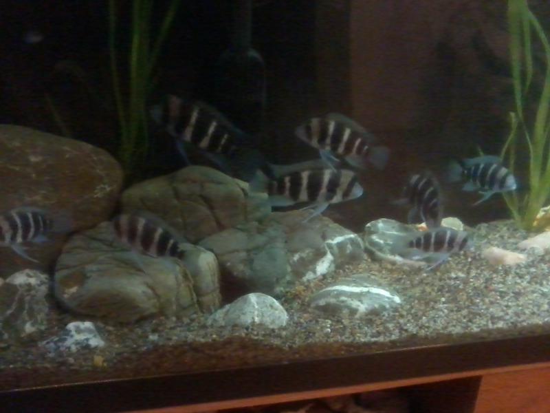 Рассмотрев свой дизайн в очередной раз, кардинально его изменила, убрав все песчаные камни. Стало больше полезной площади, да и фронтоза перестала прятаться. Принцесс всех отсадила, запустила десяток молодых кальвусов, неолампрологусов бушера ''гомби', так любезно презентованых мне Кусто (пользуясь случаем, еще раз скажу спасибо). В скором времени ожидаю новых постояльцев -халинохромиса Бришара от Саши (Dionis).