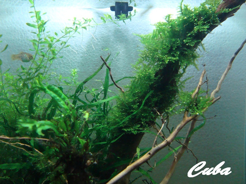 Растения-Все медленно растет, хороший рост только у мха. Кубе не хватает света ростки тянутся вверх. Оборудование-После ремонта по замене вилки фильтр был возвращен в аквариум, также был удлинен сетевой шнур.
