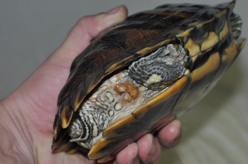 Руслан, при прощупывании этого образования черепаха реагирует как на боль? Нет ощущения нарывов при надавливании легком? Просто по сравнению с первым фото вроде как ярче это образование стало - или это просто так кадры вышли?