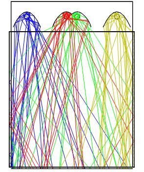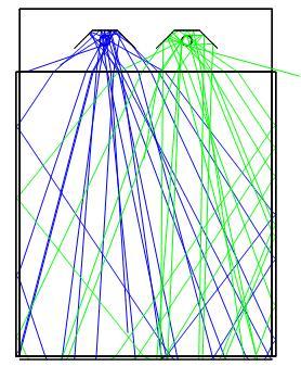 Расчет выполнен для случая, когда аквариумный светильник накрыт черными пластиковыми заслонками. Свет, попадающий на поверхность крышки, считаем полностью поглощенным. Для рисования схем выбрано небольшое число лучей, что бы не затенять рисунок. Для анализа количества света, достигшего приемника, выбрано 100 000 случайно генерированных источником лучей.