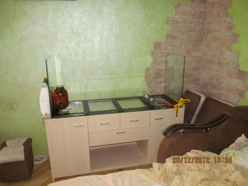 Литраж такой-же как у Вас. Клеить уже научился, но только проблема в запахе в квартире и детях, которые постоянно норовят пальчиком залезть в силикон. Оно ведь так классно потрогать и вытереть чёрным о что-либо. Крышку тоже сам делал. Ещё надо в ней окантовку из уголка алюминиего сделать. Отражатели из водосточной трубы за 64 грн, обклееные оракалом и подогнутые феном строительным для придания формы параболы. Кстати есть остаток 1,5 м.п. этой трубы. Валяется. Из ламп: