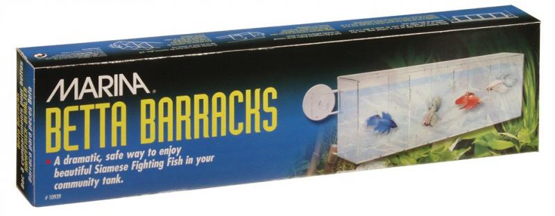 Marina Betta казармы является безопасным способом содержания и наслаждения красивым видом боевых сиамских рыбы в вашем аквариуме. Бетта казармы позволяет разместить до четырех петушков сразу в безопасных и отдельных камерах. Прозрачные стены обеспечивают превосходную видимость цвета бетта и крышка предотвращает их от выпрыгивая. Бетта казармы поставляется в комплекте с присосками для легкой установки.