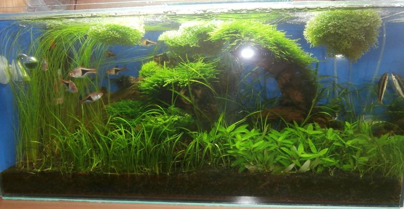 Вот сообразил на работе небольшой скейп в банке Resan DN400H (40 литров). Коряга еще не тонет, пришлось притопить камнем, который явно кидается в глаза, но со временем планирую его убрать.