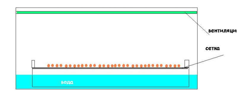 Я бы отобрал через месяц. Мой инкубатор на фото. Две емкости одна в одной. Сетка - капрон. Вот изъятая внутренняя емкость