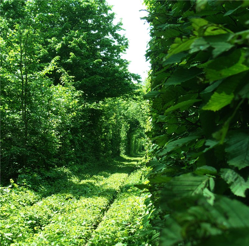 В теплое время года, когда распускаются в полную силу листья на деревьях, зеленое одеяние растущих рядом друг с другом деревьев образуют сказочный зеленый туннель вокруг километрового отрезка железной дороги.