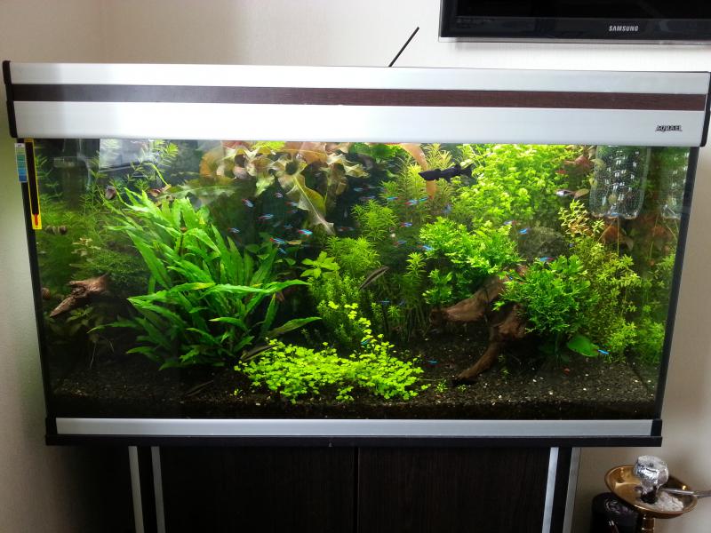 Симпатично все получилось, свет правильно добавили. Я вообще с производителей поражаюсь, одни крышки с двумя креплениями другие с одним вообще, для цихлидников видать  ) Не забывайте менять раз в пол года лампы и травка будет процветать, а вообще подумайте о диодах, экономно и горят 50 000 часов а не 5000 как обычные все лампы.