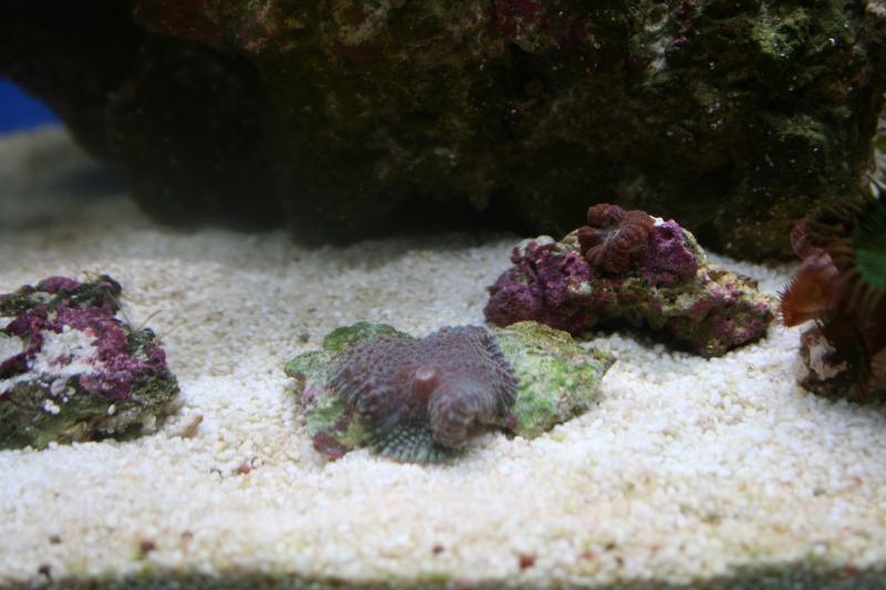 Ту актинию поставь лучше так, что бы на нее свет не сильно светил. Лучше так, что бы над ней камень нависал. Она нефотосинтетик, свет ей особо то и не нужен. А то сбежит, будеш потом искать в какую щель она залезла. И течение тоже не сильно любит она. И сарка с эуфилией, покс есть место, разведи по разным сторонам аквариума. У меня они не сильно любилр друг друга. Глядиш и сарк откроеться.
