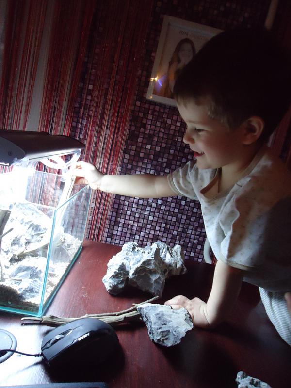 Ребята давно на мои аквариумы глаз положили, но сами пока ничего не делали. Кроме конечно самых элементарных вещей, таких как кормление обитателей, внесение папиного УДО, и конечно поддержка и подача оборудования при фотографировании и стрижках.