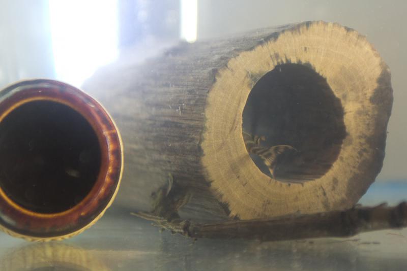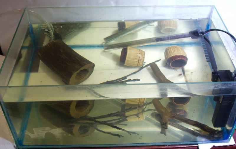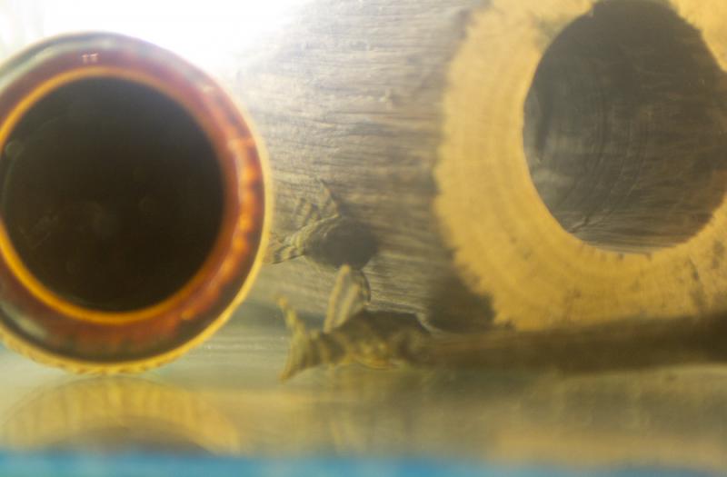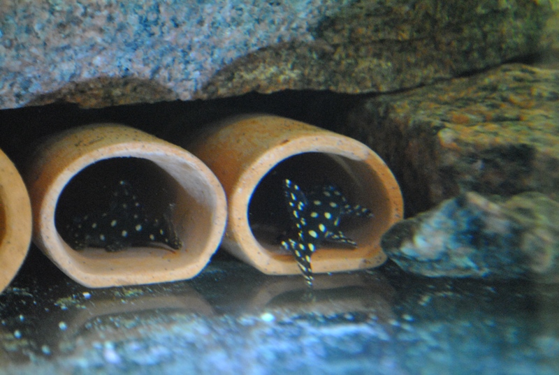 В качестве укрытий в аквариум пришлось установить керамические трубки, так как ничего другого не было под рукой. Чуть позже предложил рыбкам перевернутую вверх дном керамическую тарелку, о которой упоминается в одной из статей о разведении, но рыбки ее проигнорировали. По видимому этап, когда мальки стайкой прячутся в одном укрытии, для моих сомиков остался в прошлом.