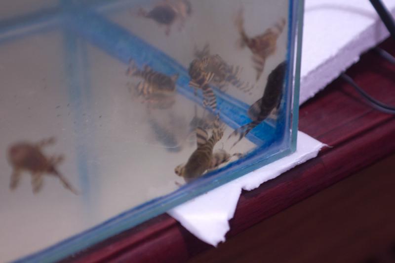 К моменту появления новичков, 340-е уже чуть подросли и я боялся, что они будут прессовать новоселов , но проверить предположение было сложно, так как при моем появлении , даже если свет в помещении был выключен, рыбки прятались в укрытия. Интересно было бы понаблюдать , что происходит в аквариуме с наступлением ночи. Неделя проходила за неделей, но размер мальков практически не изменялся. Ни в какое сравнение с 340-ми. Даже, не смотря на то, что меню сомиков расширил за счет тетра дискус, тетра таби мин , мороженой моины, живого циклопа и трубочника.Пожалуй, ни одна рыба у меня не видела такого разнообразия кормов. Одно из двух- или сомики значительно медленнее растут по своей природе или все же более крупные 340-е не дают им нормально питаться. Что бы исключить последнее, в аквариум установил стеклянную перегородку, но , даже живя отдельно, сомики не радуют скоростью роста. Прошло еще около месяца, прежде, чем стало заметно, что мои 201-е немножко подросли.