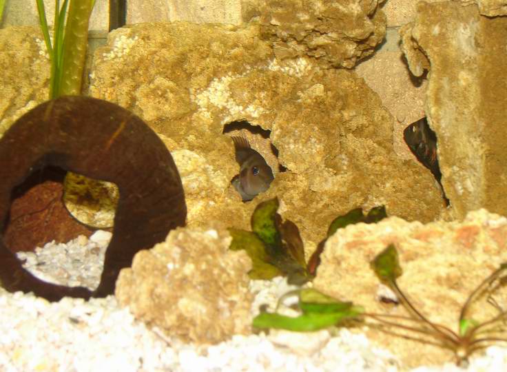 Вот, переделал аквариум. Давно хотел цихлидник, да и чернополоски томились в маленькой банке. Известняк подобрал на окружной, долго мучался с пещерами, пока нашел способ делать, не разваливая камень.