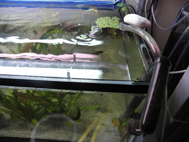 Этот большущий аквариум был вылечен в основном выключением МГ ламп, оставил долько досвет трубками. Обыльные подмены и 9 Вт стерилизатор. В течении недели побороли цветение. Потом аквариум стал сам очень активно светлеть. Включились нужные бактерии.